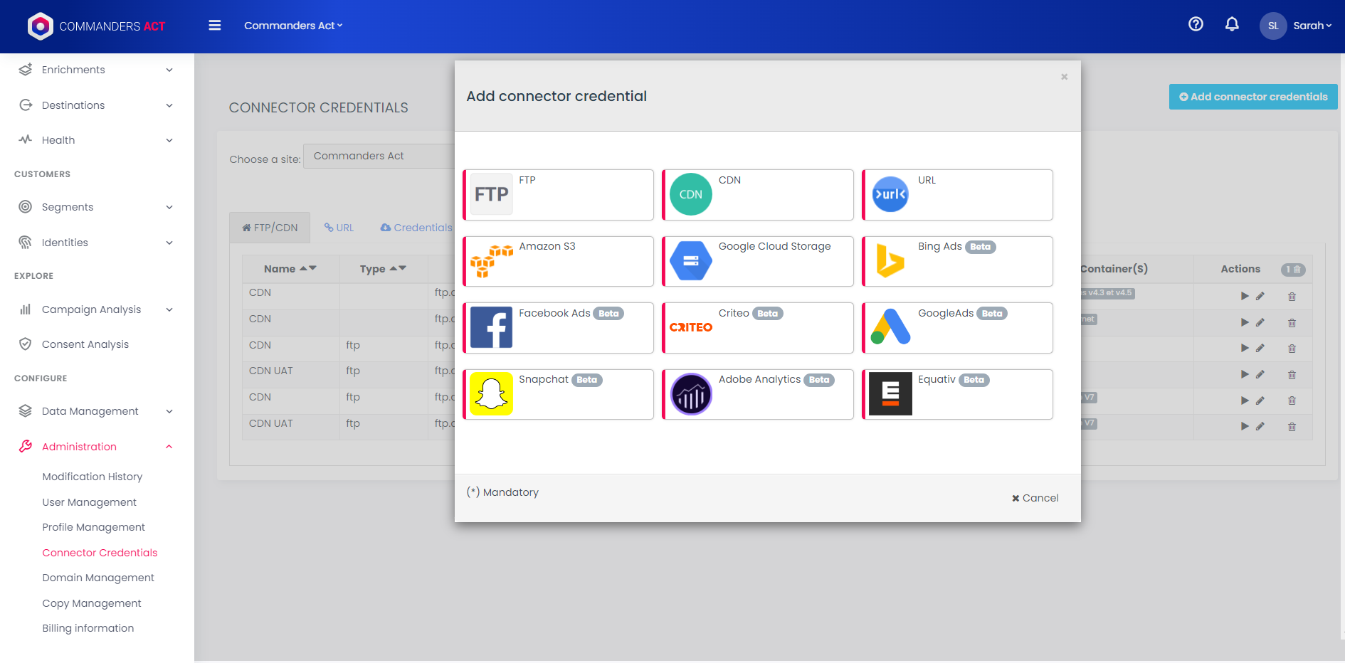 Dans tous les cas : pour un nouvel espace de travail, vous devrez configurer le connecteur sur la plateforme. Utilisez le menu Administration => Connector Credentials pour ajouter un nouveau connecteur