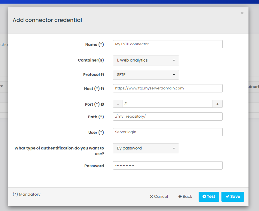 C’est presque identique au connecteur FTP, il y a seulement 2 étapes supplémentaires :\