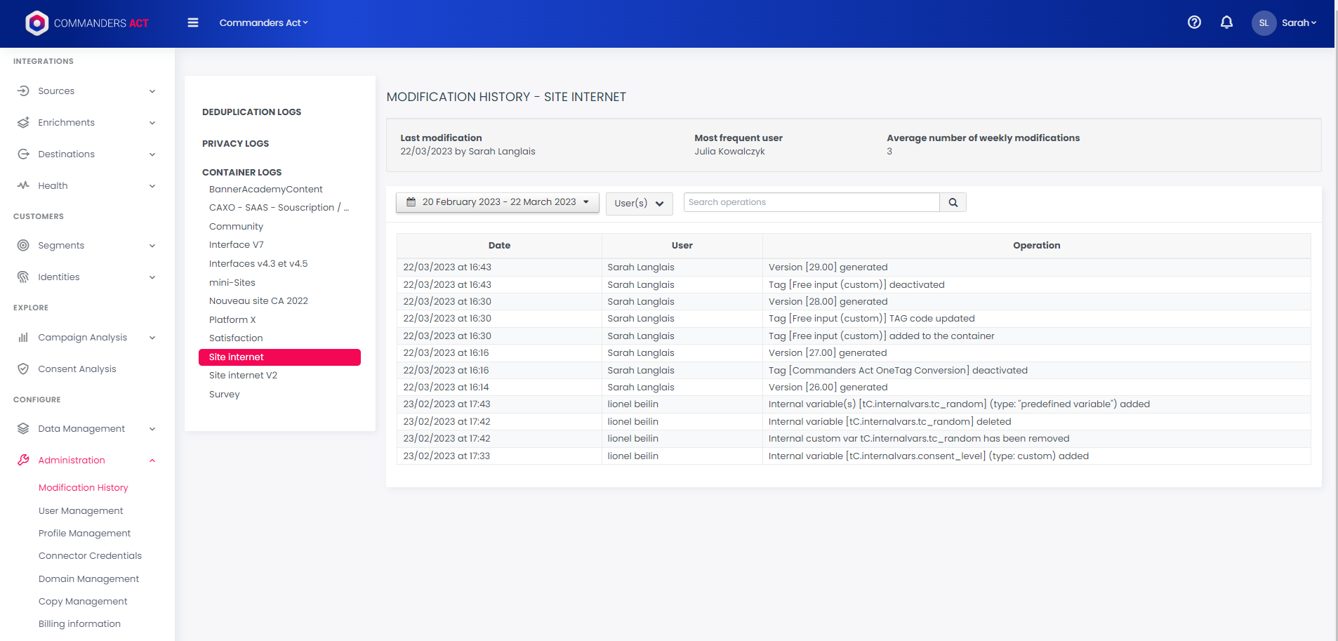 Toutes les modifications effectuées sur les containers et les bannières de confidentialité **au cours des 36 derniers mois** sont enregistrées sur la page de Modification History\