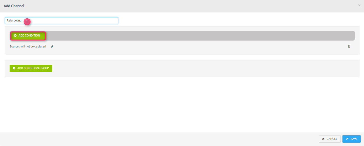 1. Dans la fenêtre qui s’ouvre après avoir cliqué sur “ADD CHANNEL”, saisissez le nom de votre nouveau canal (Display, Affiliation, Retargeting, etc.) – il s’agit uniquement d’un libellé pour l’identifier dans la liste des channels de l’interface – puis cliquez sur “ADD CONDITION”.