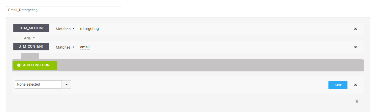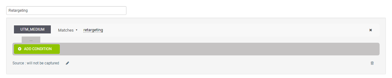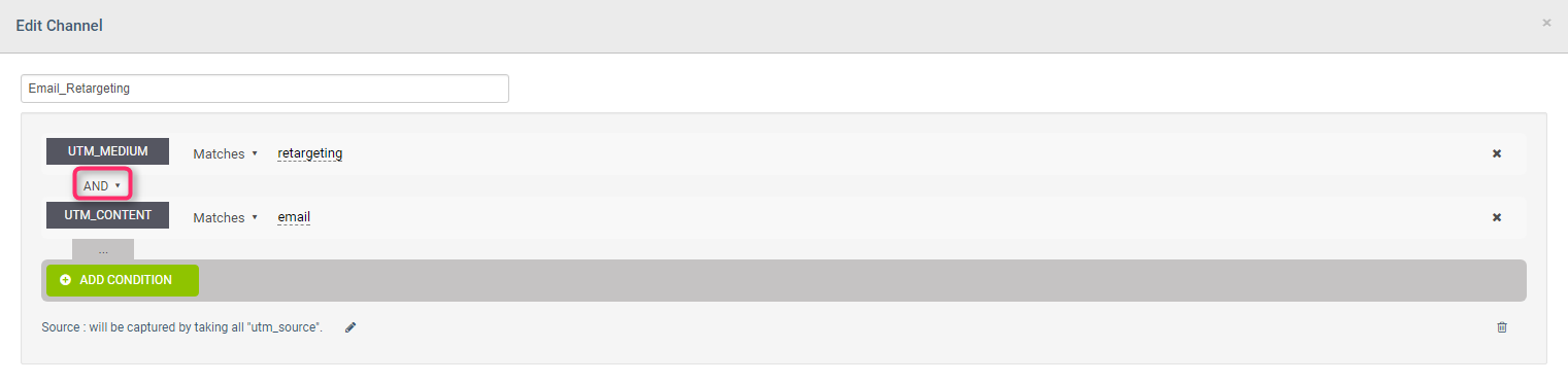 1. Vous pouvez également créer des conditions basées sur l’opérateur “AND”. Par exemple : si les valeurs du paramètre UTM\_MEDIUM sont “Retargeting” ou “rtg” AND la valeur du paramètre UTM\_CONTENT est “email”, alors le channel Retargeting sera reconnu (voir la deuxième capture d’écran ci‑dessous).