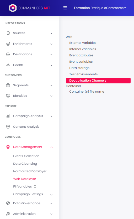 1. Allez dans le menu "Data Management" > "Web Datalayer" > "Deduplication Channels"