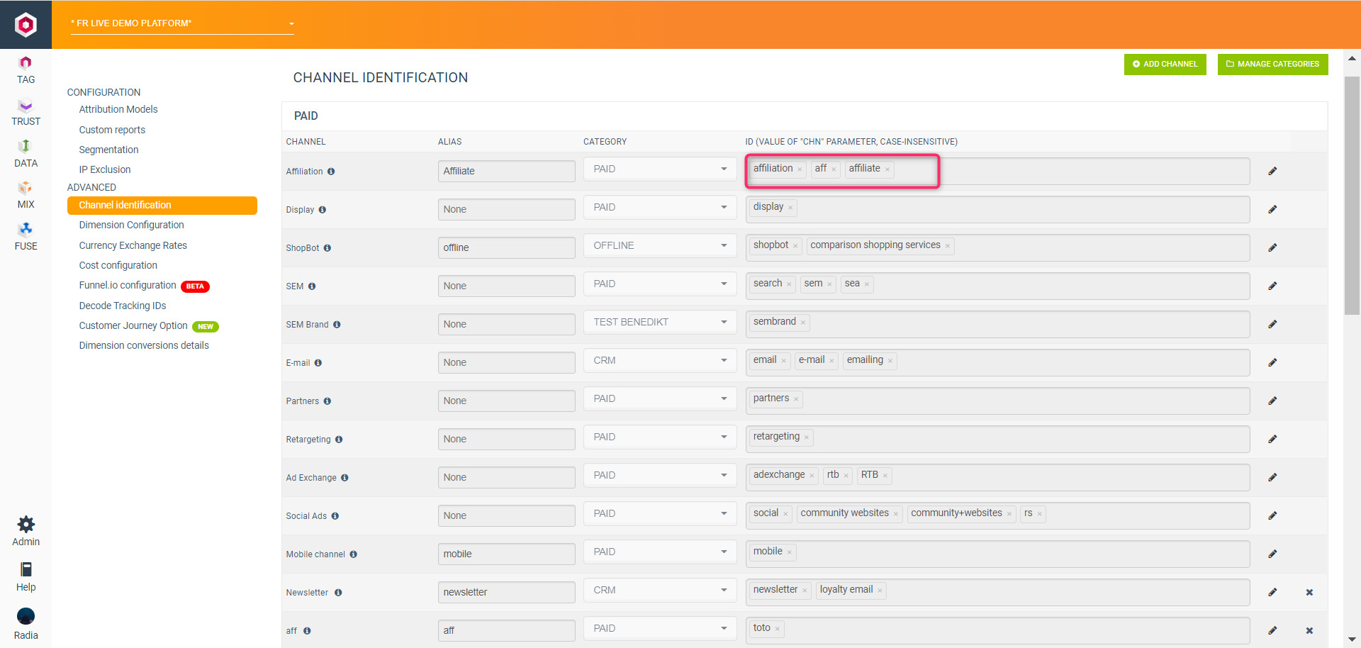 Vous devez simplement saisir les valeurs iD disponibles côté Mixcommander. Pour chaque valeur, vous devez déclarer un channel. Par exemple pour le canal AFFILIATION, vous devez créer autant de channels que d’IDs disponibles dans la table de correspondance ("Affiliation", "aff", "affiliate"). C’est pourquoi il est très important, lorsque vous créez une campagne, d’utiliser toujours le même id. Exemple : chn=affiliation.