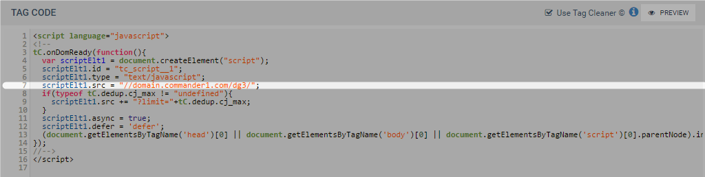 Dans la section “Edit”, assurez‑vous que le tag appelle bien votre sous‑domaine “commander1.com” (scriptElt1.src = “//domain.commander1.com/dg3/”). Si ce n’est pas le cas, veuillez contacter notre support ([support@commandersact.com](mailto:support@tagcommander.com)). Aucune configuration supplémentaire n’est requise pour ce tag.
