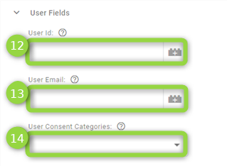 Dans la "**User Fields**" section vous pouvez définir `(12)` le "**User Id**" et `(13)` "**User Email**" - L'un ou l'autre est requis si vous sélectionnez l'événement "Purchase". Le `(14)` "**User Consent Categories**" est un champ obligatoire contenant un array avec les identifiants des catégories de consentement de l'utilisateur.