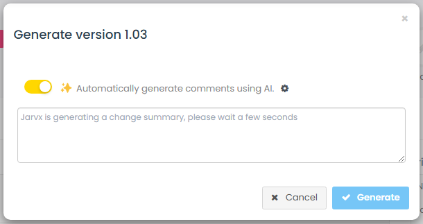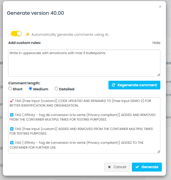 When a user generates a web container in the **Tag Management System (TMS)**, Commander's AI analyzes the modifications and provides an automatic summary of the changes made since the last container generation.