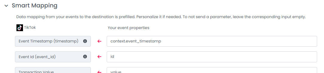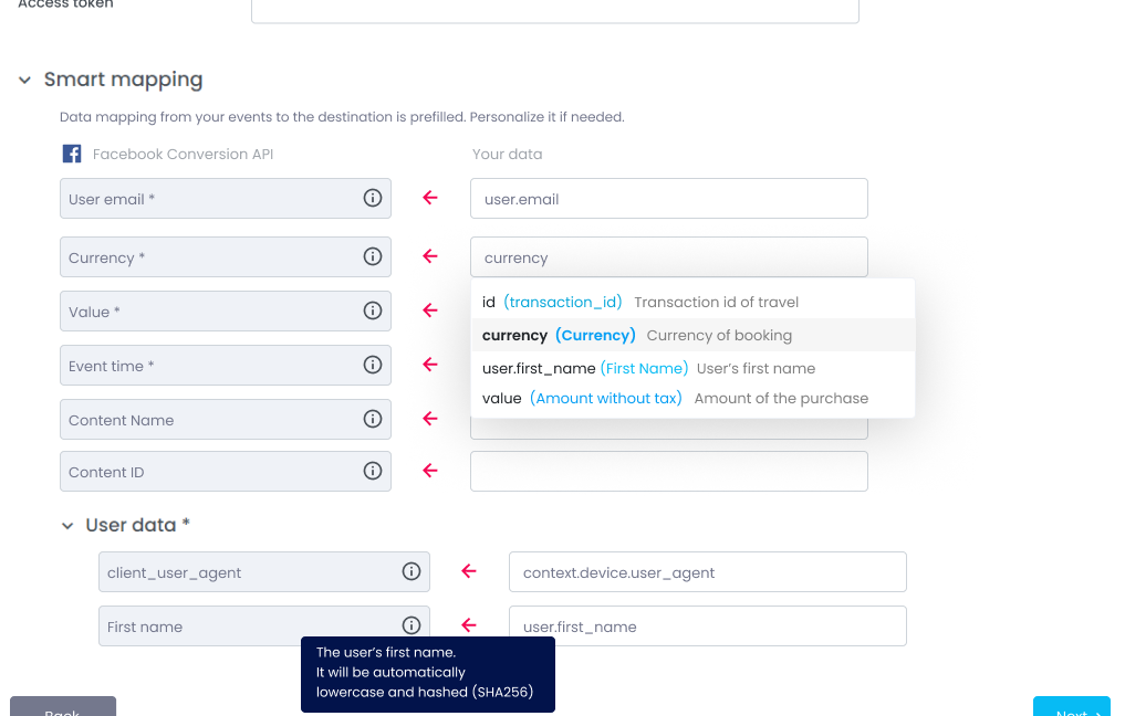 * New feature : **smart mapping** (closed alpha) : visualize/edit the data mapping done automatically by the system between your event properties and the destination's API.\