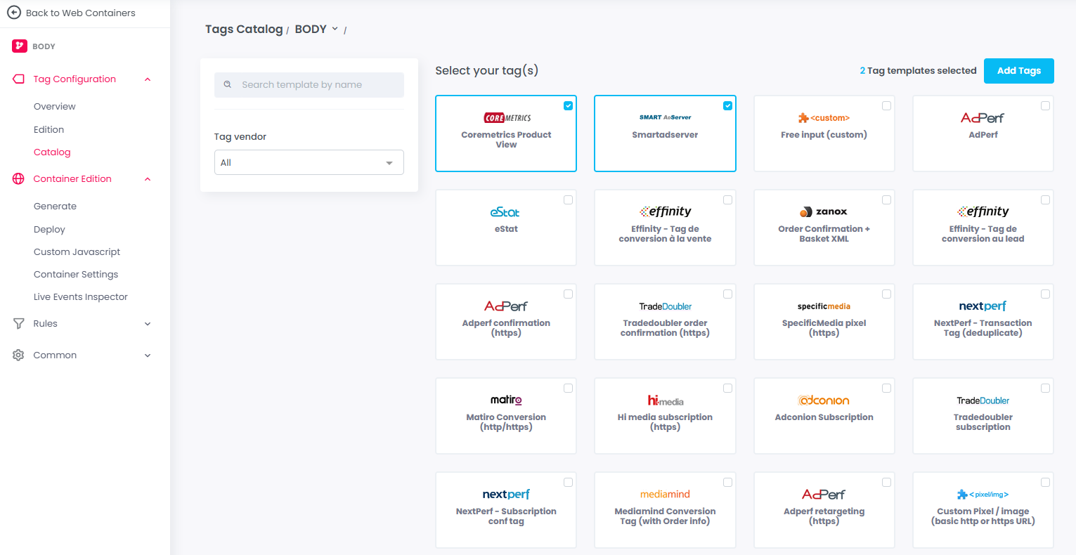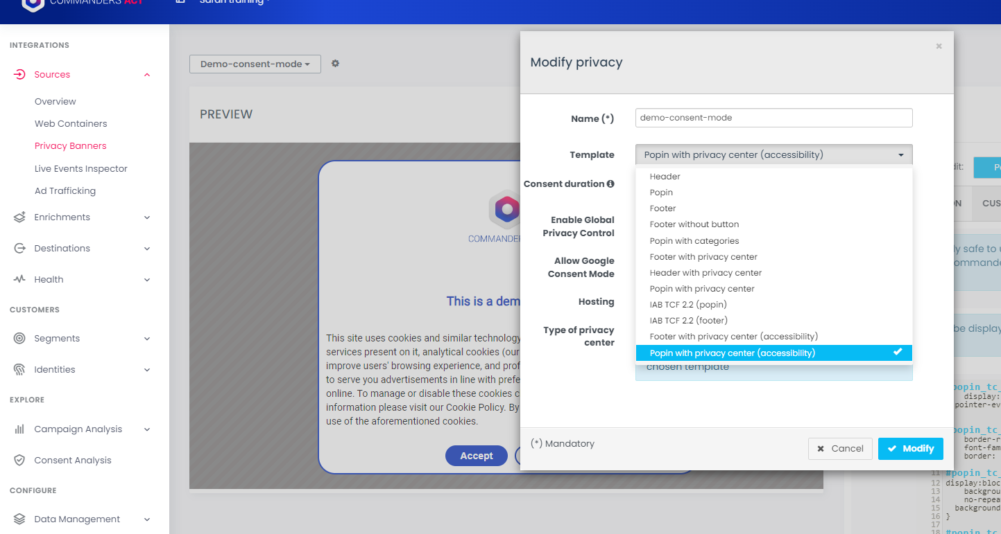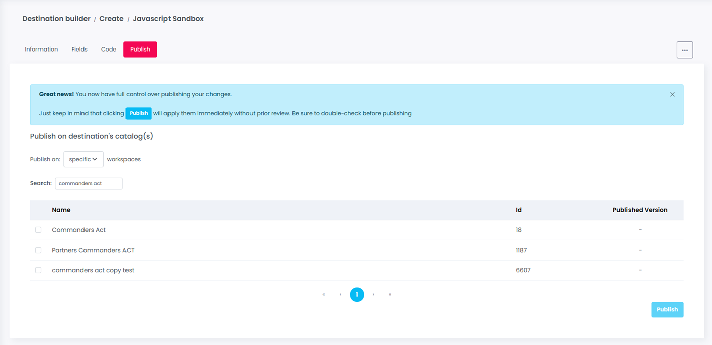 * Template importer (closed alpha) : import in the destination catalog your custom destination template build with the [sandbox JS](https://doc.commandersact.com/features/destinations/destination-builder/javascript-destination-builder)\