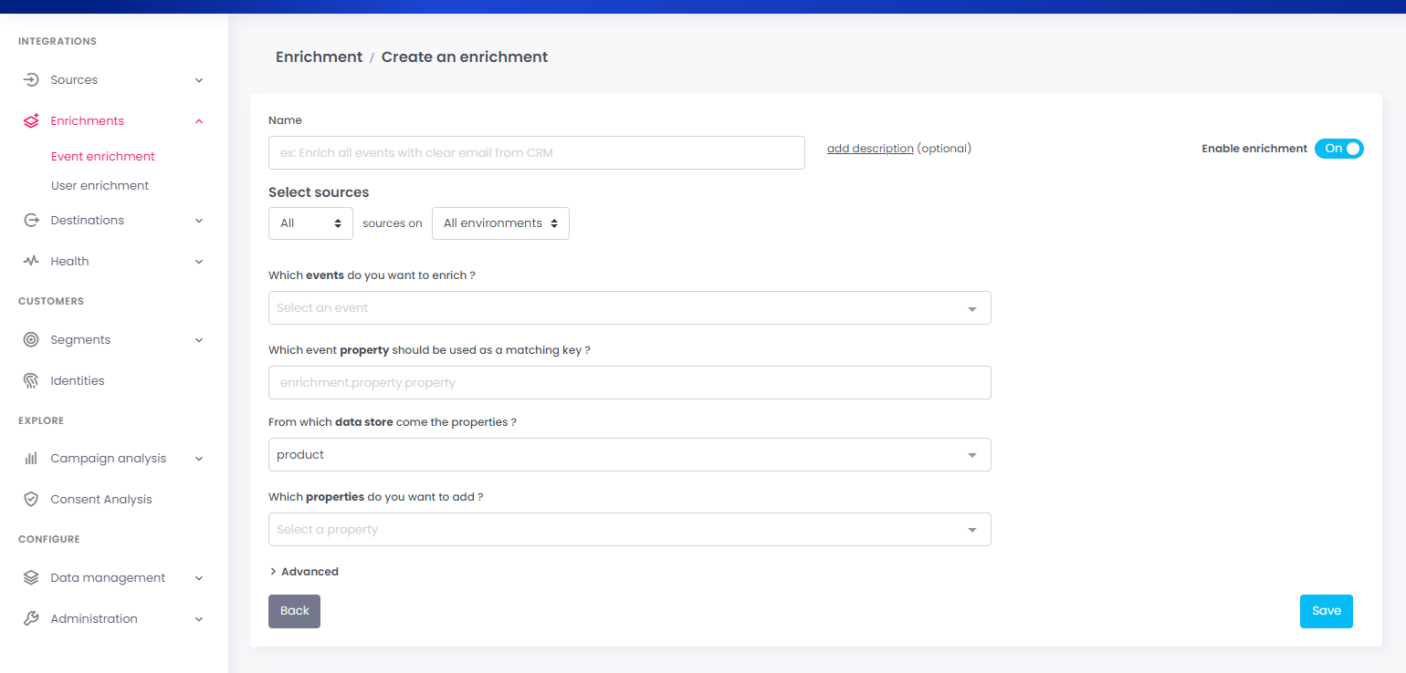 * **Event enrichment from your Product catalog:** Copy in realtime time any properties of your imported product catalog to your choosen event.\