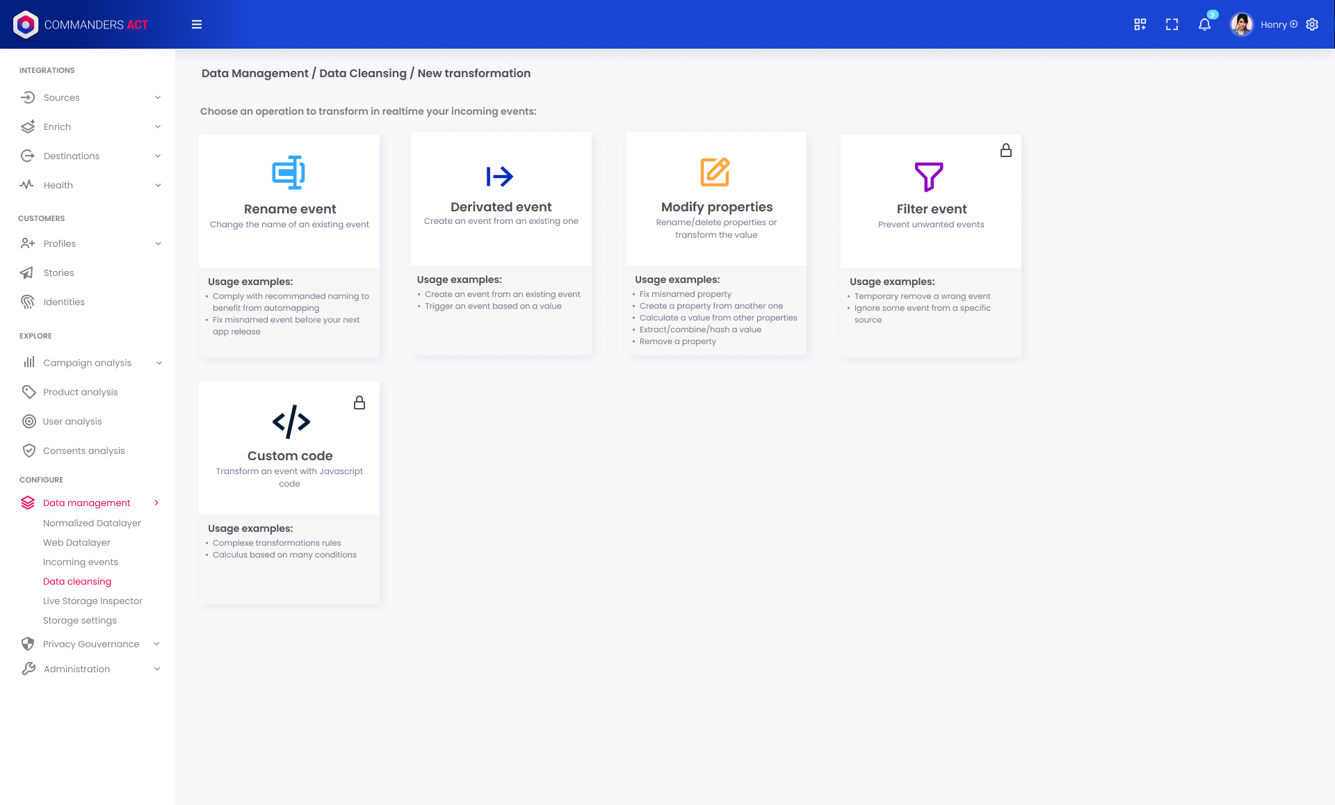 * [**Data Cleansing**](https://doc.commandersact.com/features/data-quality/data-cleansing) **no-code :** Clean, fix, refine your event data with a userfriendly interface (closed beta) *Public opening on 21 Nov.*\ <img src="https://1259070148-files.gitbook.io/~/files/v0/b/gitbook-x-prod.appspot.com/o/spaces%2F-Mk6XpTQ2LaRLcr2tA-d%2Fuploads%2Fgit-blob-e8b1331a25843b29a6c1909123c4a50739bec636%2Fimage.png?alt=media" alt="" data-size="original">![](https://1259070148-files.gitbook.io/~/files/v0/b/gitbook-x-prod.appspot.com/o/spaces%2F-Mk6XpTQ2LaRLcr2tA-d%2Fuploads%2Fgit-blob-95d2d4a10f39f0bac9cc38f64cd046f673702f27%2Fimage.png?alt=media)